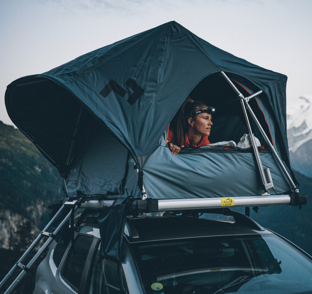 Namiot dachowy na samochodzie terenowym zaparkowanym w górach, nocleg na dachu auta podczas wyprawy outdoorowej
